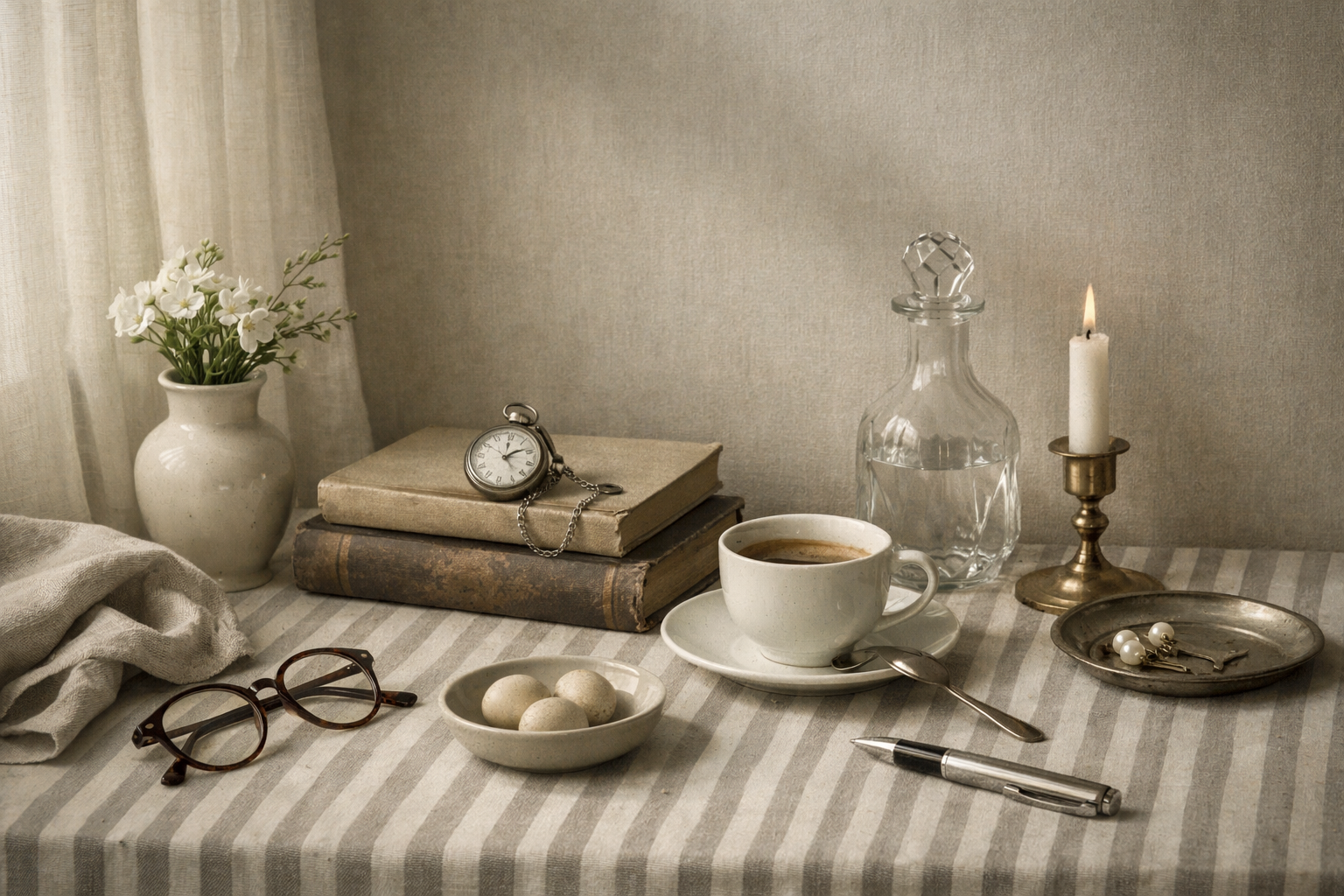 “Can you create a still life photo for me to work from with muted colors, a striped tablecloth, and morning light with random classy household objects. I want something very sophisticated and understated.”